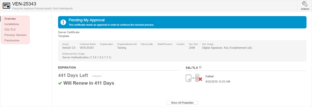 The Actions button in the upper-right corner allows you to take certain allowed actions on the certificate. The actions that are available depend on both the certificate status, as well as your account's permissions relative to the certificate. If no actions are available to you, that information will appear when you click the Actions button.