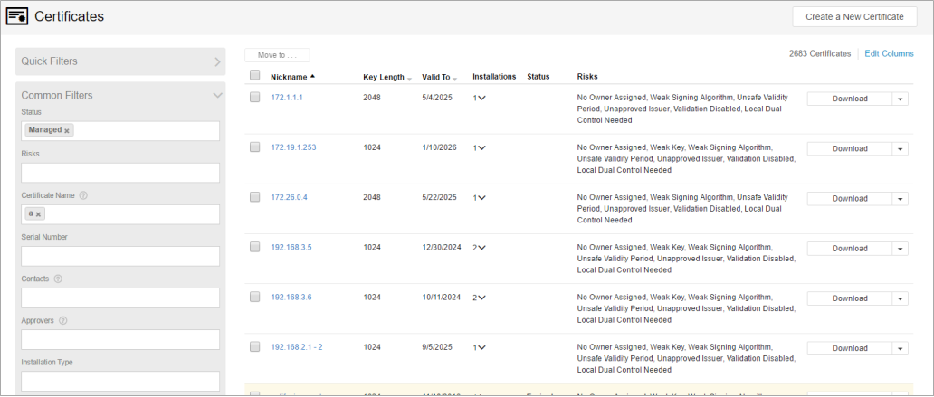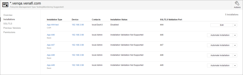 The action button on the right side of each row gives you the option to perform various actions on the installation. For more information on installations and the actions you can take, see Certificate installations.