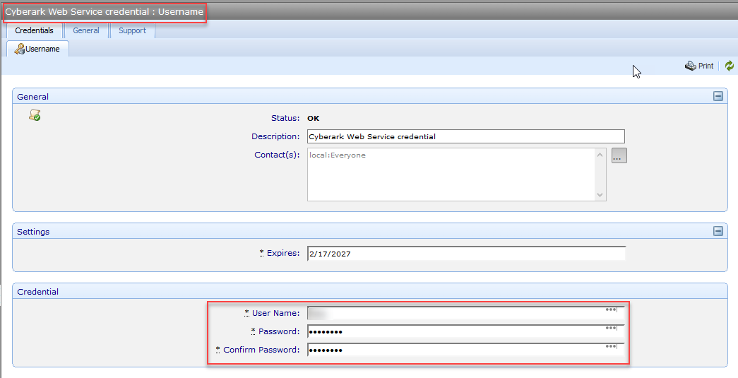 In the Credential field, specify the same User Name and Password that you set up in the CyberArk vault.