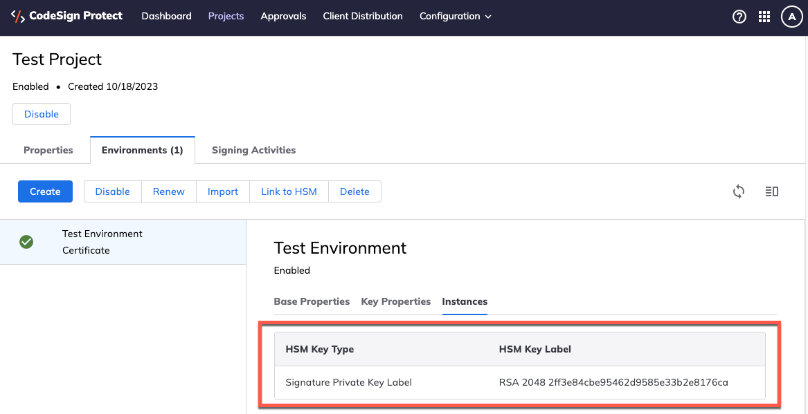 After you finish creating the Environment, you'll be able to see the HSM Key Label by opening the Project, selecting the Environment, and then clicking the Instances tab on the Environment properties.