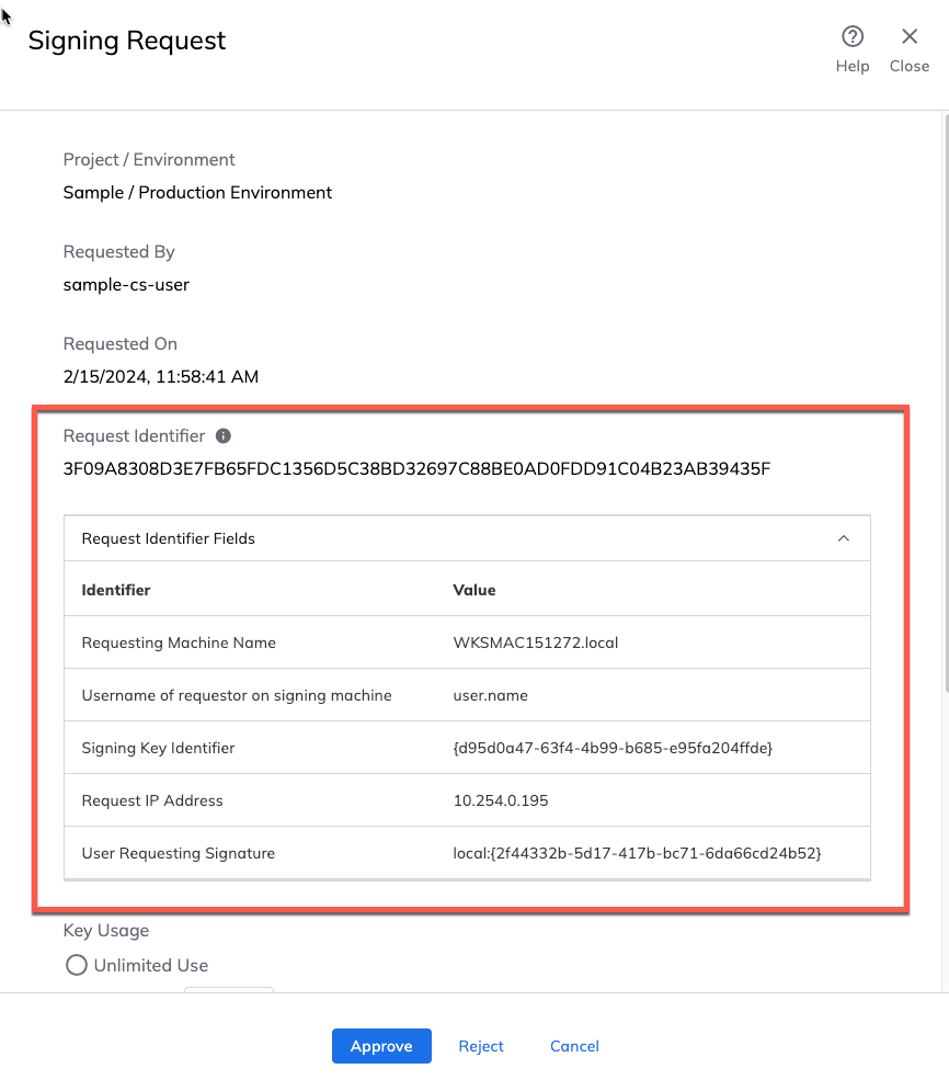 When a Key Use Approver approves a signing request, they will see both the request identifier as well as the request identifier fields, as shown in the screenshot below: