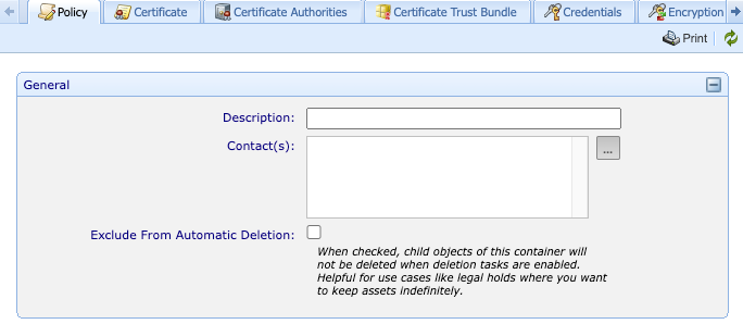 NOTE There is a configuration that exists on all WebAdmin policy objects called Exclude from automatic deletion. When this setting is enabled, these objects will be ignored by the automatic deletion features of the Recycle Bin. A use case for this feature is when there is a legal hold where you want to maintain assets indefinitely.