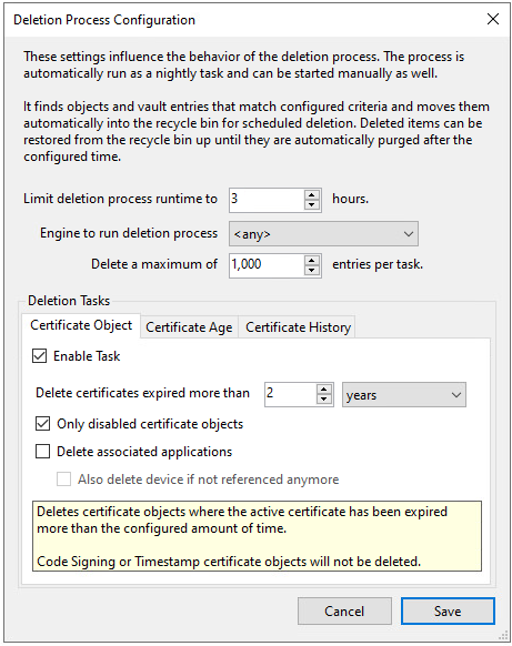 The Certificate Age and Certificate History deletion tasks are configured to operate exclusively on archived certificates. This ensures that only those certificates specifically designated for deletion are processed.
