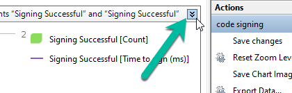 For this series, select Code Signing and Signing Successful again from the Counter drop-downs. Then, in the View box, click the Show Time to sign checkbox. A line with the average signing time per month is overlayed on top of the chart.