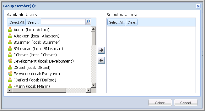 From the Available Users list, select the users and groups you want to add to the current group, and then click the Right-arrow