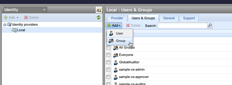 To create users and groups, you must have Read, Write, and Create permissions to the Local Identity object.