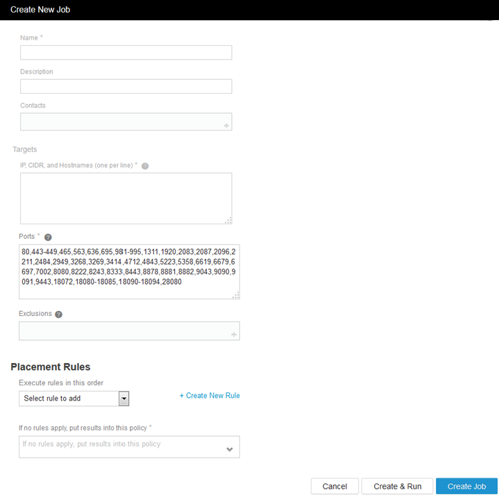 • Exclusions: Addresses, ports, CIDRs, and host names that should not be scanned.