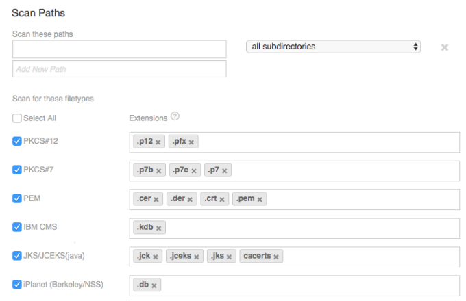 NOTE The /dev and /proc directories on Unix and Linux platforms cannot be scanned. They are intentionally excluded because they are not common (nor recommended) locations for storing keys and certificates.