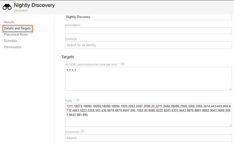 NOTE You must create exclusions in order to see them in the list. To learn how to create exclusion objects, see Excluding IP addresses and host names from discovery scans.