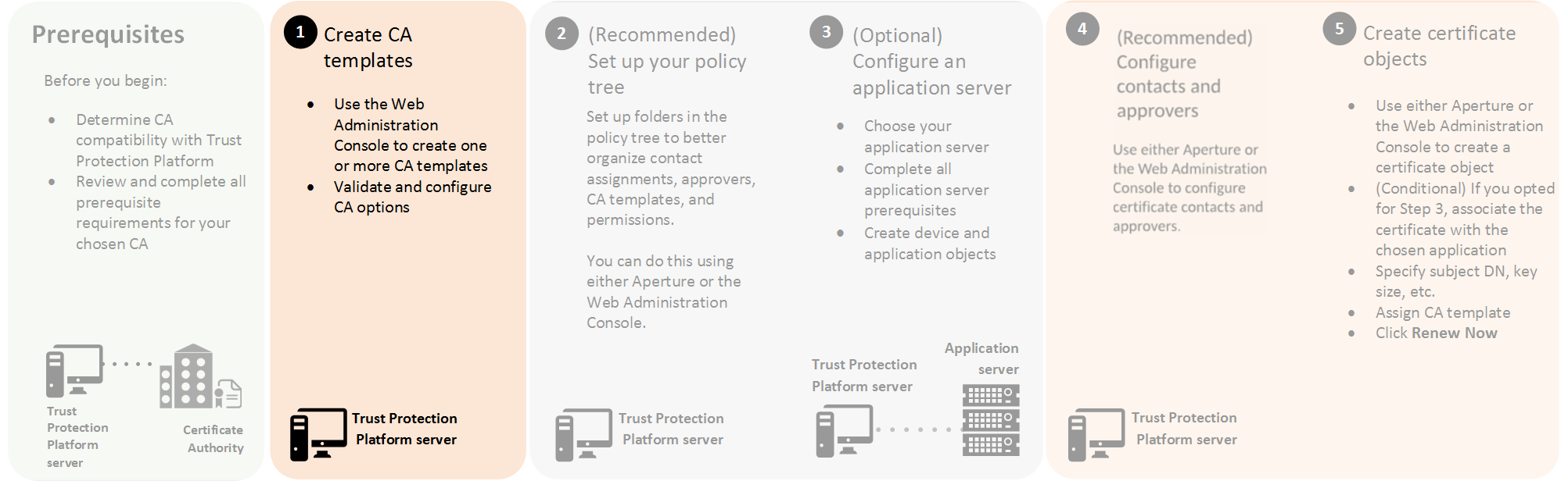 CA template objects provide the information Trust Protection Foundation needs to submit the certificate signing request (CSR) to the CA and retrieve the signed certificate. The CA template also defines the type of certificate that is requested from the CA when the CSR is submitted.
