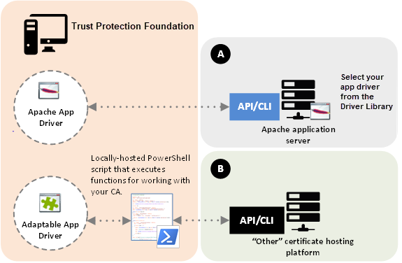 Adaptable drivers depend on a Microsoft PowerShell script hosted in your local environment to execute functions corresponding to standard certificate lifecycle stages or Trust Protection Foundation events.