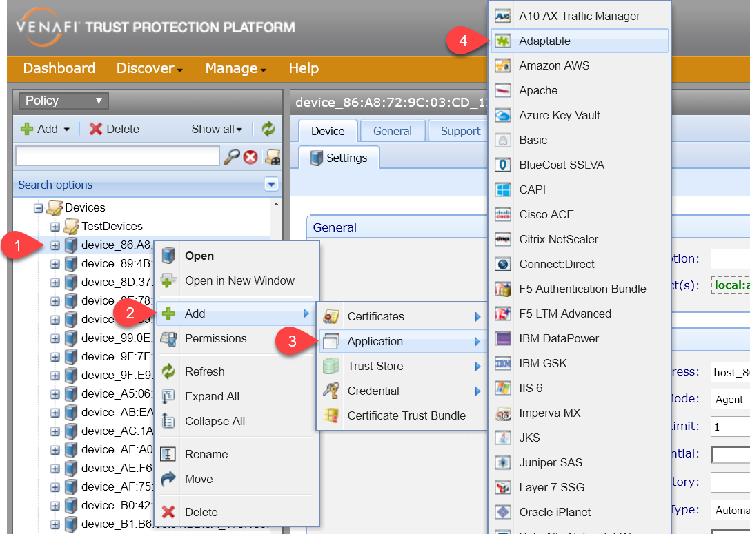 EXAMPLE Suppose you want to automate certificate provisioning for your MyAppliance server. In the Policy Tree, you would first create and configure a device object for your MyAppliance server, and then you would create and configure a MyAppliance application object.