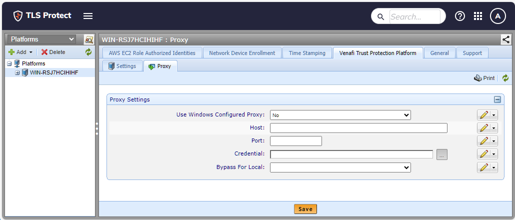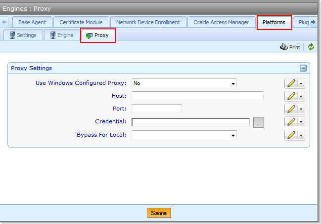 A proxy can be configured on an individual Trust Protection Foundation engine if the proxy setting at the root of the Platforms tree has not been locked. Setting a proxy configuration on an individual Trust Protection Foundation engine overrides the value set at the root of the Platforms tree.