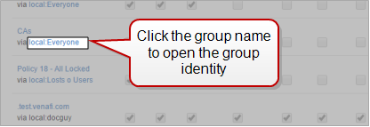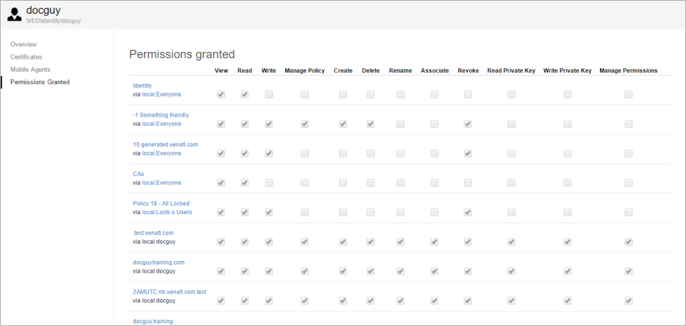 The Permissions Granted panel shows the object in the policy tree (policy/folder, certificate, or device) where the permission is explicitly granted. If the permission is granted to a group, you can click the name of the group to open the group identity, and see the permissions that have been granted to that group.