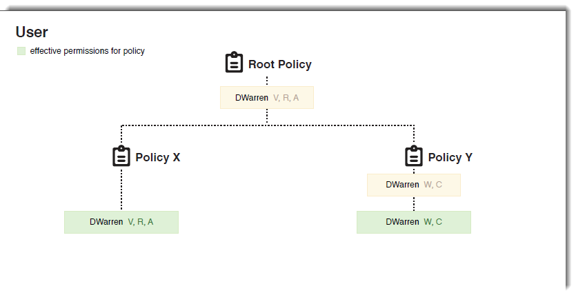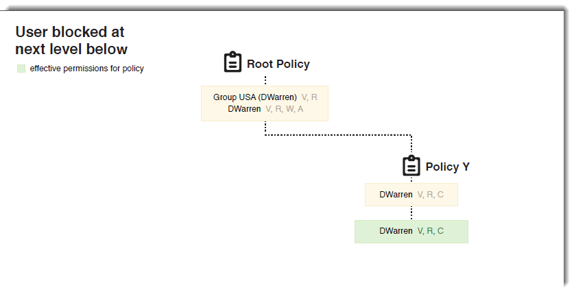 - DWarren - For Policy Y, permissions were reassigned at Policy Y. Even though the Root Policy grants V, R, & A, the user permission reassignment at Policy Y overrides the Root Policy permissions.