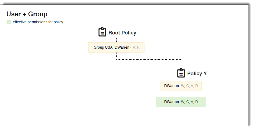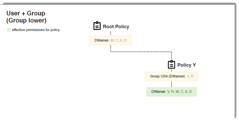 - DWarren has User permissions of V, R, W, and A and Group permissions of V and R at the Root Policy. Group USA gives him additional permissions of W, C, and D for Policy X. DWarren's effective permissions for Policy X are V, R, W, C, D, and A.