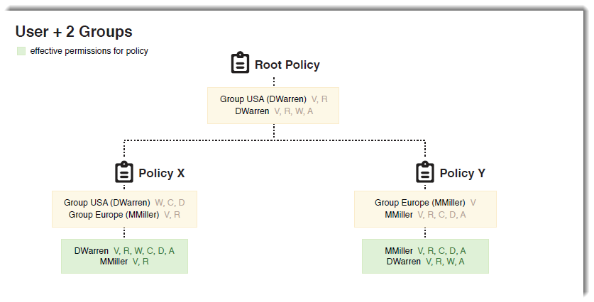 - MMiller has User permissions of V, R, C, D A for Policy Y. Group Europe grants him the permission of V. MMiller's effective permissions for Policy Y are V, R, C, D, and A.