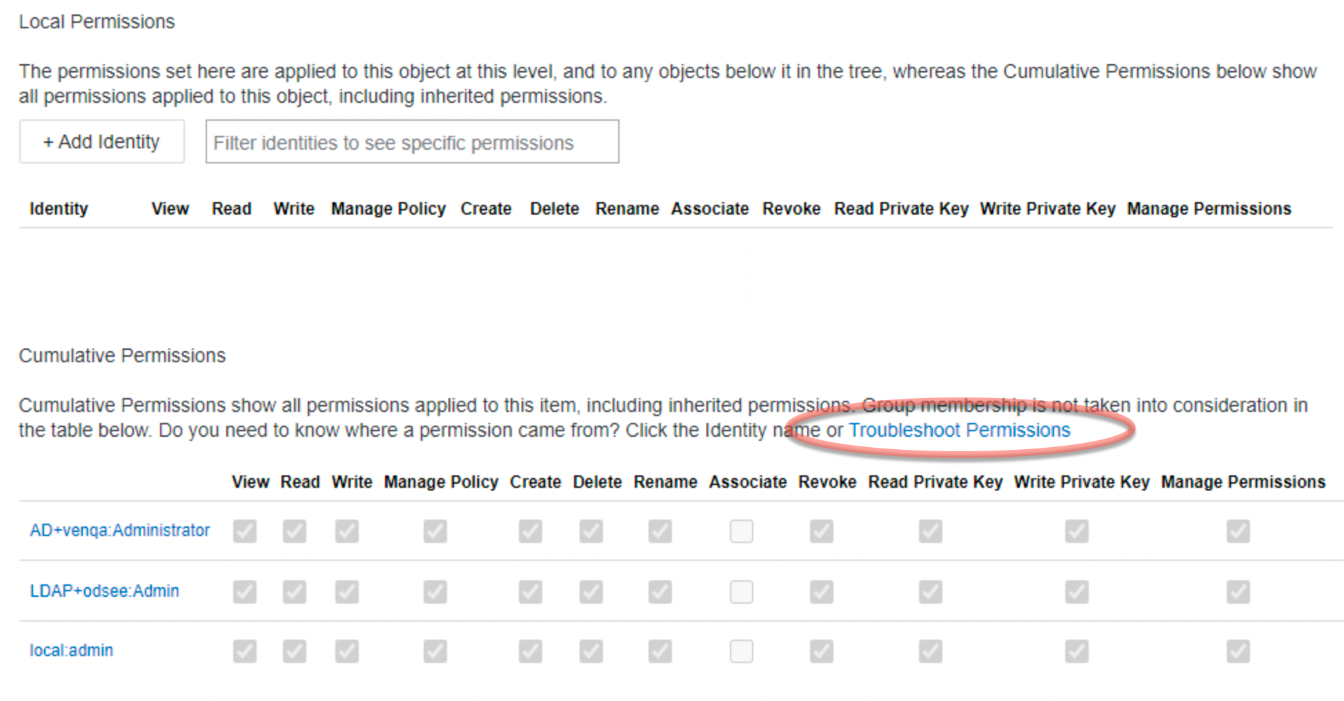 For each identity, you see the effective permissions granted to that identity at any level of the folder structure. If an identity has permissions granted in multiple places in the folder structure, you see the individual entries, followed by a summary of all permissions they have to the object. If you have the manage permissions privilege for an object or identity, you can click its name to see permissions information.