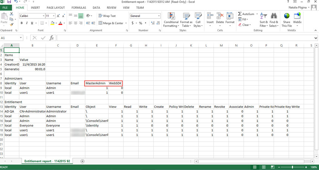 The Entitlement Report shows all users that have access to the encryption management system. The report displays the following information for each user: