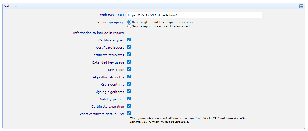 Send single report to configured recipients sends the report to the recipients specified in the Setup & Delivery tab. Send report to each certificate contact sends an individual report of assets to each certificate contact. |
