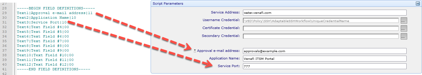 \Venafi\Scripts\AdaptableSSHCertificateIssuanceFlow\\Venafi\Scripts\AdaptableSSHManagement\folder. - Locate the Begin Field Definitions section and determine where you want to place your new field.
