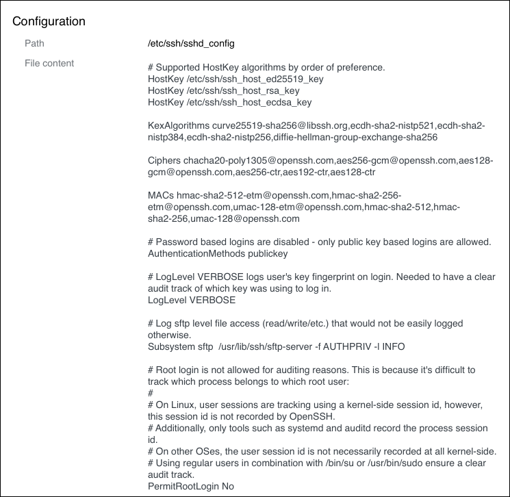 Trust Protection Foundation uses a server's sshd_config file to discover SSH keys. The sshd_config file contains information that tells Trust Protection Foundation where to look for keys. You can view the raw data in the config file using SSH Manager for Machines.