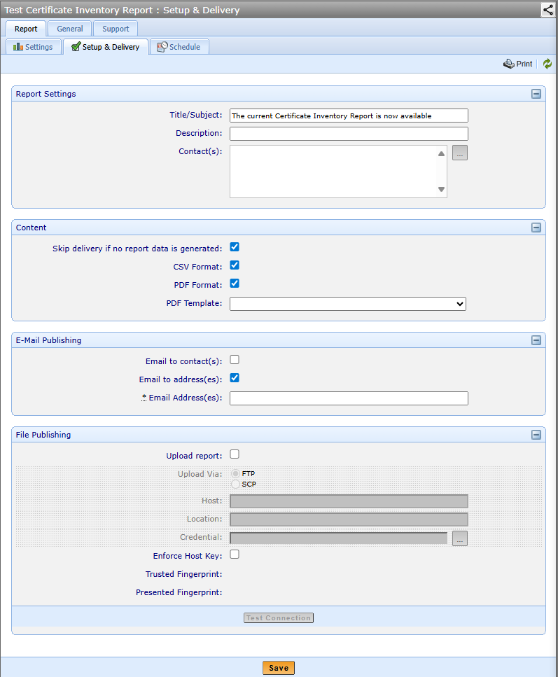 Send single report to configured recipients sends the report to the recipients specified in the Setup & Delivery tab. Send report to each certificate contact sends an individual report of assets to each certificate contact. |